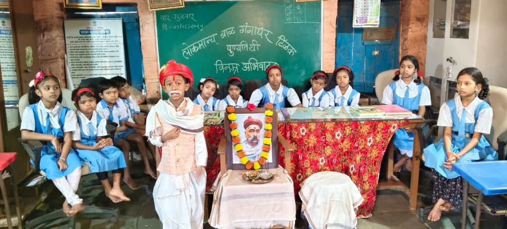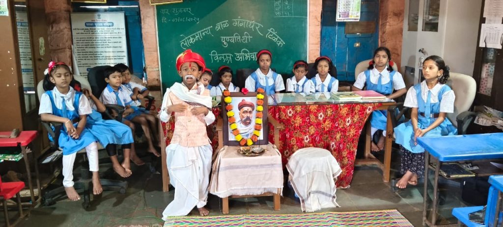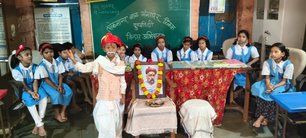 बालसभेच्या अध्यक्षस्थानी लोकमान्य टिळकांची वेशभूषा केलेला इयत्ता तिसरीतील विद्यार्थी प्रणव किरण लोहकरे हा होता.शाळेतील विद्यार्थी यांच्या हस्ते लोकमान्य टिळक यांच्या प्रतिमेस पुष्पहार अर्पण करून पूजन करण्यात आले.